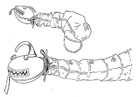 Dies ist eine von mehreren Skizzen, die Alexander Stephen (1936:292, Fig. 169) von den Wasserschlangen gemacht hat, die er auf der First Mesa gesehen hat. Sie wurden über eine etwa 90cm lange Stange im Inneren gesteuert.
