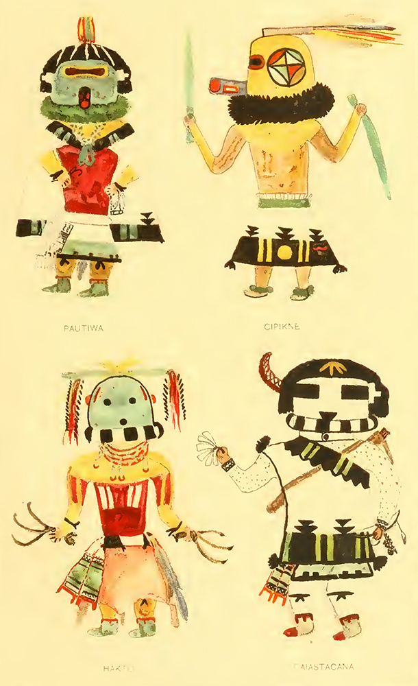 Die von Hopi gemalten Katsinam wurden schnell zu Vorlagen für Sammler, die besonders schöne Exemplare bestellen wollten. Plate II zeigt Pawtiwa, Sip-ikne, Hakto und Saiastasana (Fewkes 1903:Pl. II).